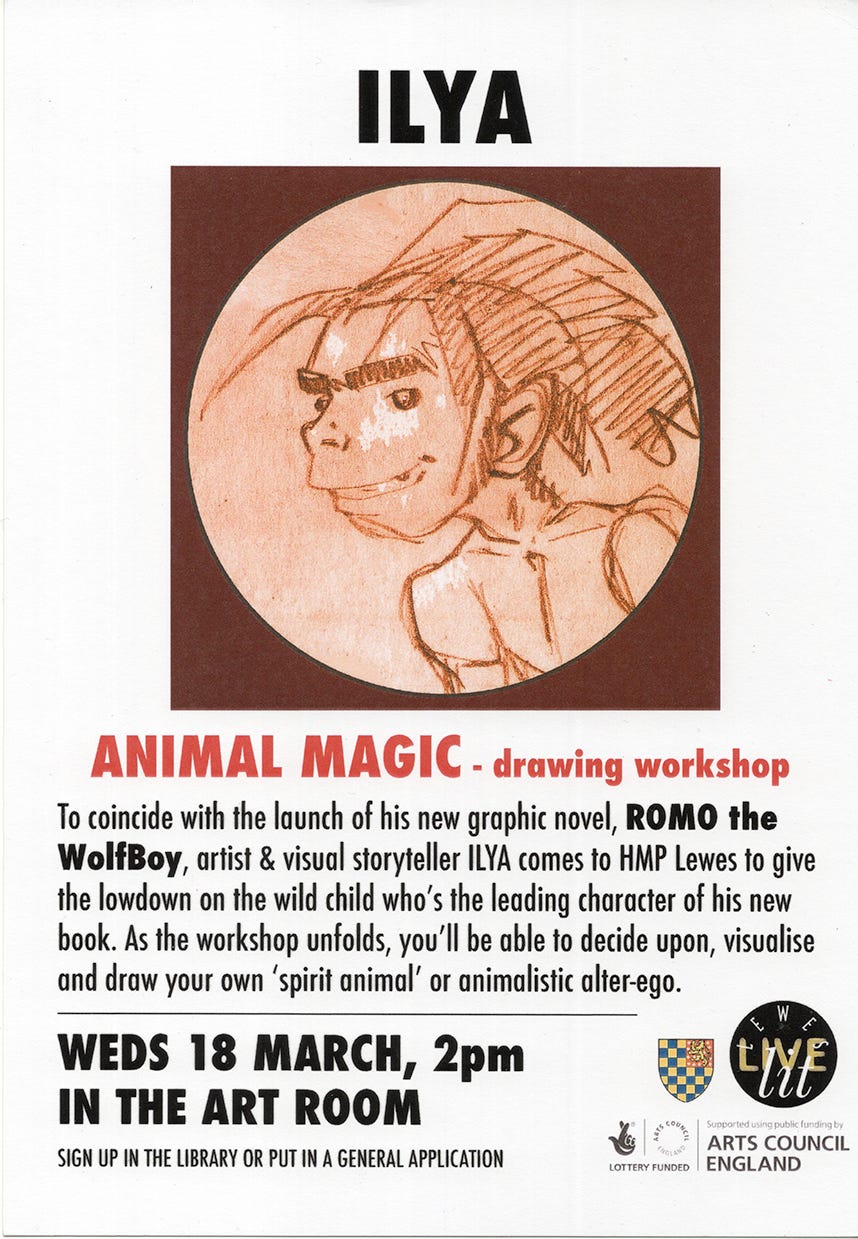 I spent some time in jail - HMP Lewes, to be exact, where I shuttled between their library and art room, before delivering a ROMO-based workshop to about 15 of the prisoners there (we have in the past been encouraged to refer to them instead as ‘customers’, but any self-respecting inmate would tell you where to shove that! minus euphemism). The theme of this afternoon workshop was ‘ANIMAL MAGIC’.