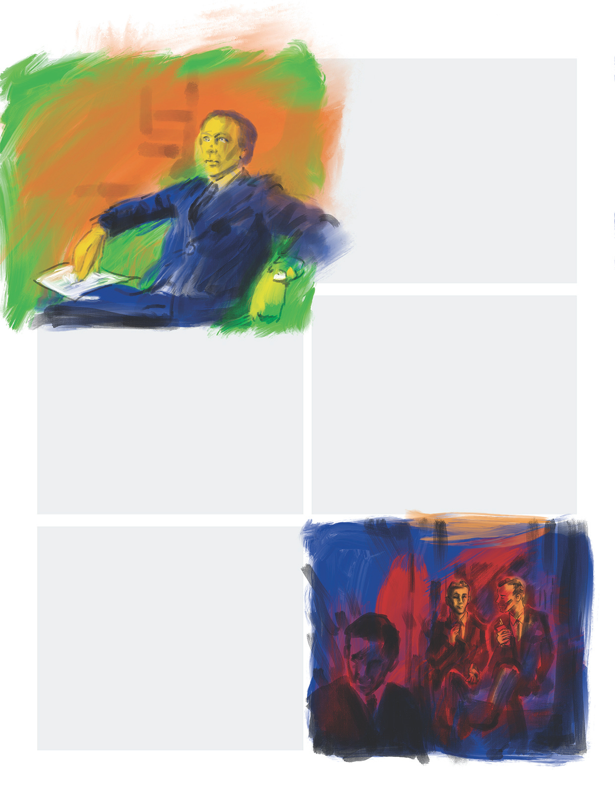 Work in Progress: MORE painting, but this time, All Digital, Nothing Analogue. Panels on the way to being composed into the first of five pages for a short piece on sexual health. It has a 1950s setting, so the notion is to try and evoke/suggest the fast and loose primary-coloured stylings of the lurid and scandalous pulp paperbacks of and from that bygone era. This sort of thing…